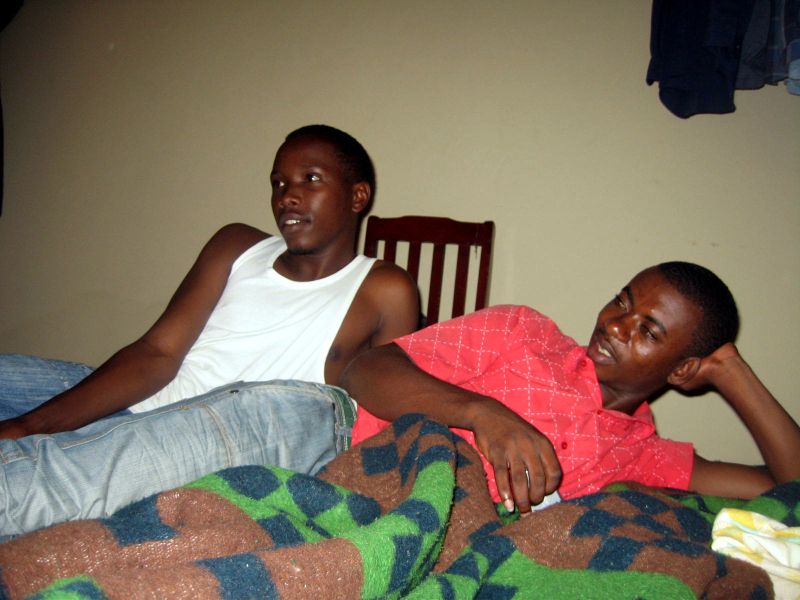 After ten days away on her own in the North of the country, in an area of lakes and – of course! – hills, Britta came back for a few days two weeks ago, apparently greatly enjoying her holiday and time away from everything. The pictures were taken on Sunday morning, after we had had 'breakfast in bed'. The guys at the other end of the bed are P and R: they had shared a bed for a year in P3 when they were in the same boarding school, but now R is a year ahead, because P had had to drop out of school for a year; (that is when he was working in the place where I lived in my first term here and I met him.) He had come to visit us a few weeks before, on his way to school, but when he came this time he was not in a good state: he had been home, and apparently hardly ventured outside the house where he lives with his mother, after having been sent away from school because he was unable to pay the school fees. He had not even told his closest local friend! – people, not just here of course, are ashamed of being poor as if it was a moral failing. Until last year, his fees had been fully covered by FARG, the organisation supporting genocide survivors, but they have recently bumped people off their list who have some relatives who might be able to pay for them. But R's mother is a primary school teacher, now working at an orphanage, and had only been able to raise half the fees for the term, so he has become another student whose school fees I/we are – in this case: partly – paying, who otherwise would have had to drop out of school.