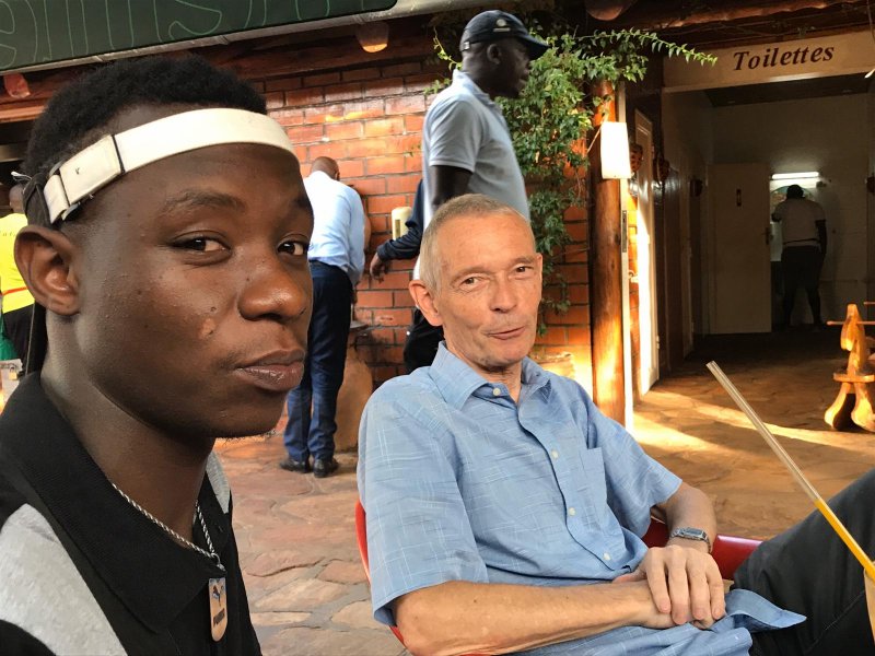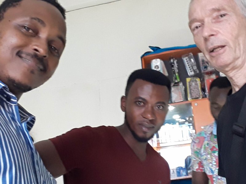 Arnold and I visiting P at his shop in town, (with Issa/Joshua busy in the background.)