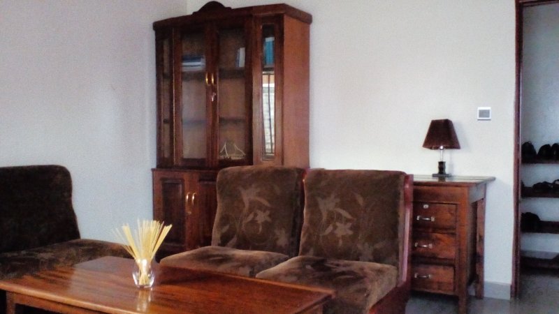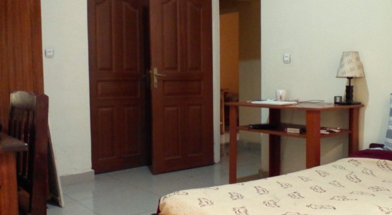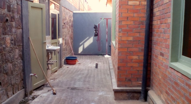 My room: as always, not just a bedroom but where I mostly live; (difficult to capture it in a photo, but it's big, with a big window looking onto the 'yard'.) Behind the door: a separate toilet/shower. Across the corridor: M's room, bigger than in Cyivugiza, and much much bigger than at Cosmos. Our own 'yard': with a very small room and a separate toilet/shower on the left, 'for a houseboy/housegirl'. Again the nice brick. Things are working well here, and things are quickly fixed, when needed. |